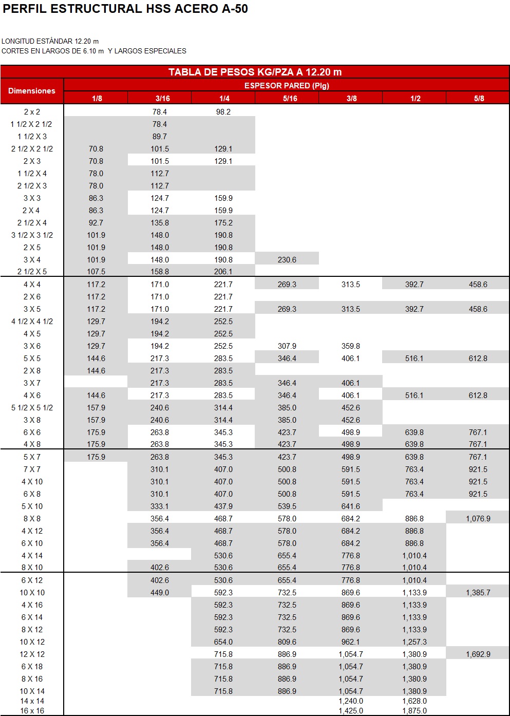 LONGITUD ESTÁNDAR 12.20 m CORTES EN LARGOS DE 6.10 m Y LARGOS ESPECIALES