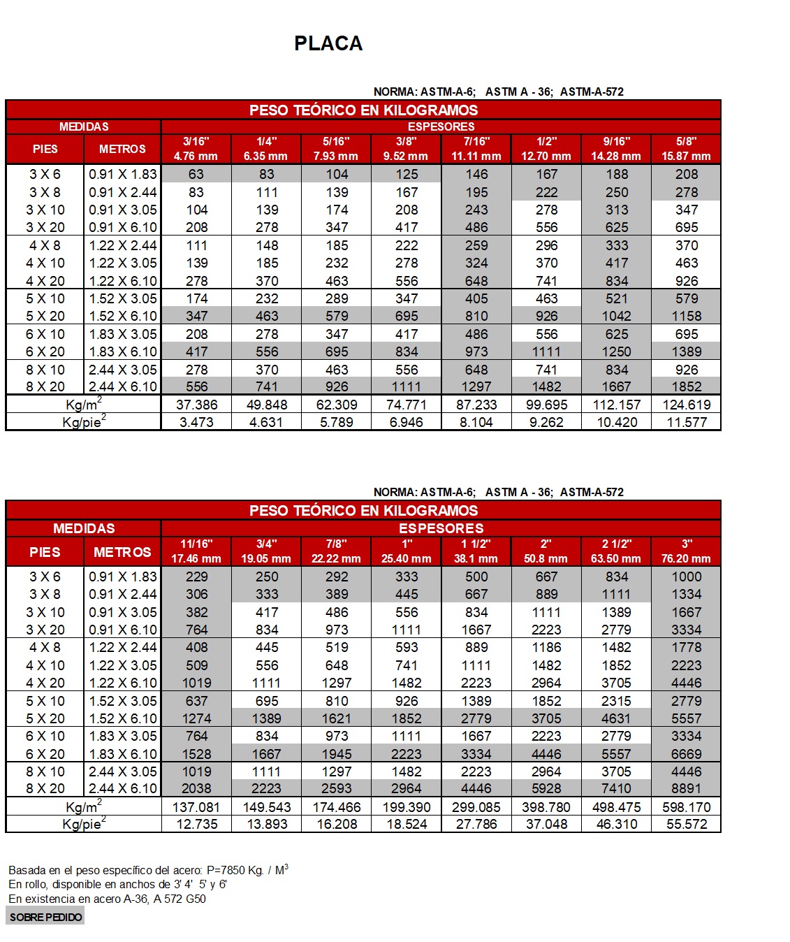 Basada en el peso especifico del acero: P=7850 Kg. / M3