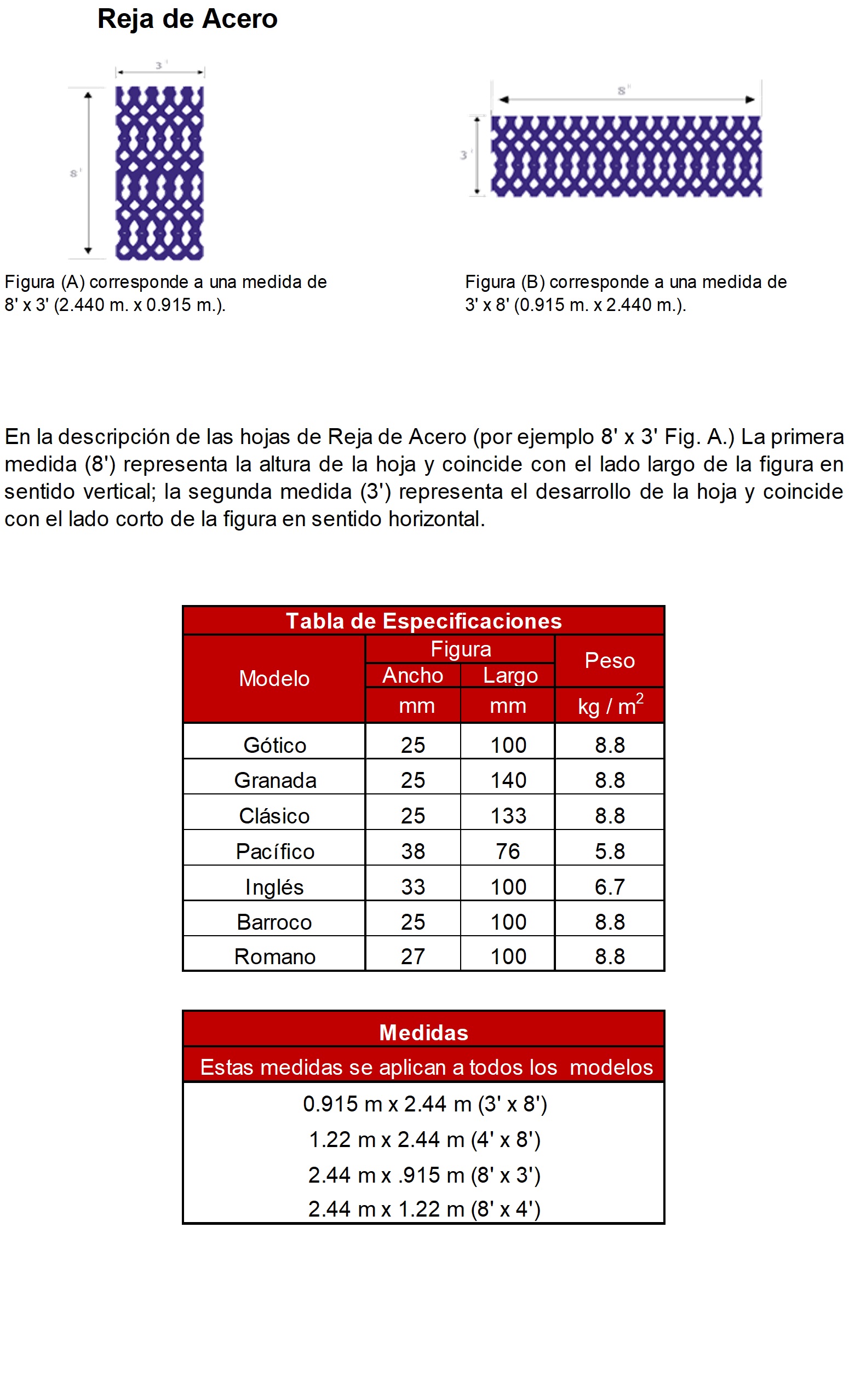 Reja de Acero (por ejemplo 8′ x 3′ Fig. A.) La primera medida (8′) representa la altura de la hoja y coincide con el lado largo de la figura en sentido vertical; la segunda medida (3′) representa el desarrollo de la hoja y coincide con el lado corto de la figura en sentido horizontal.